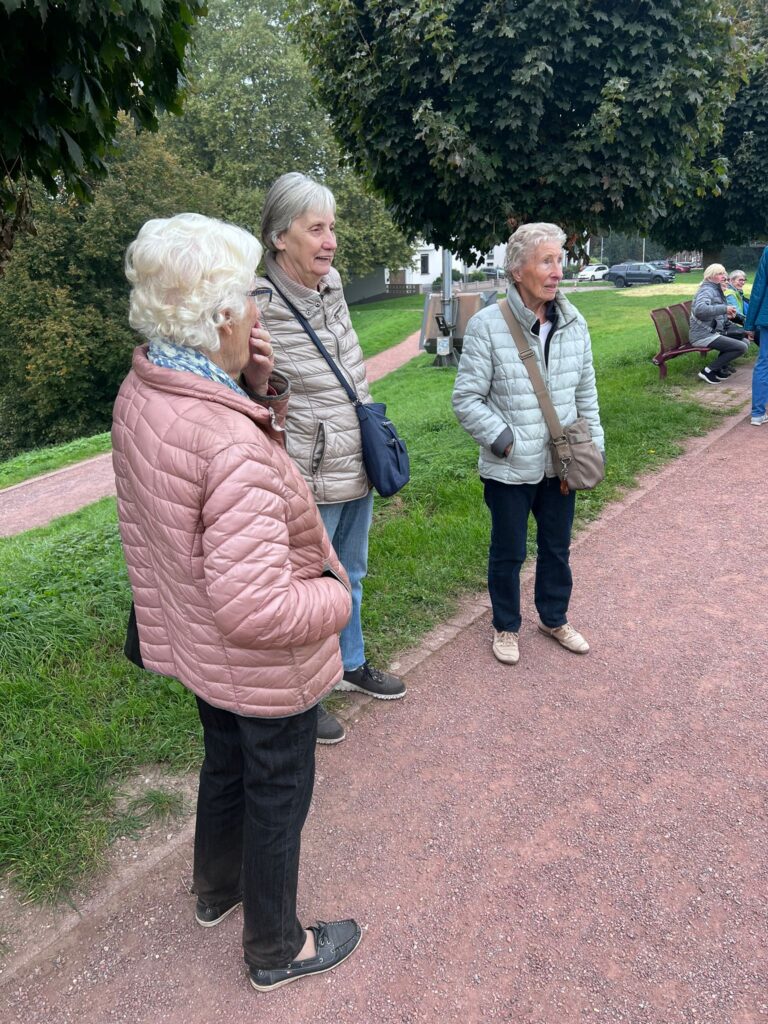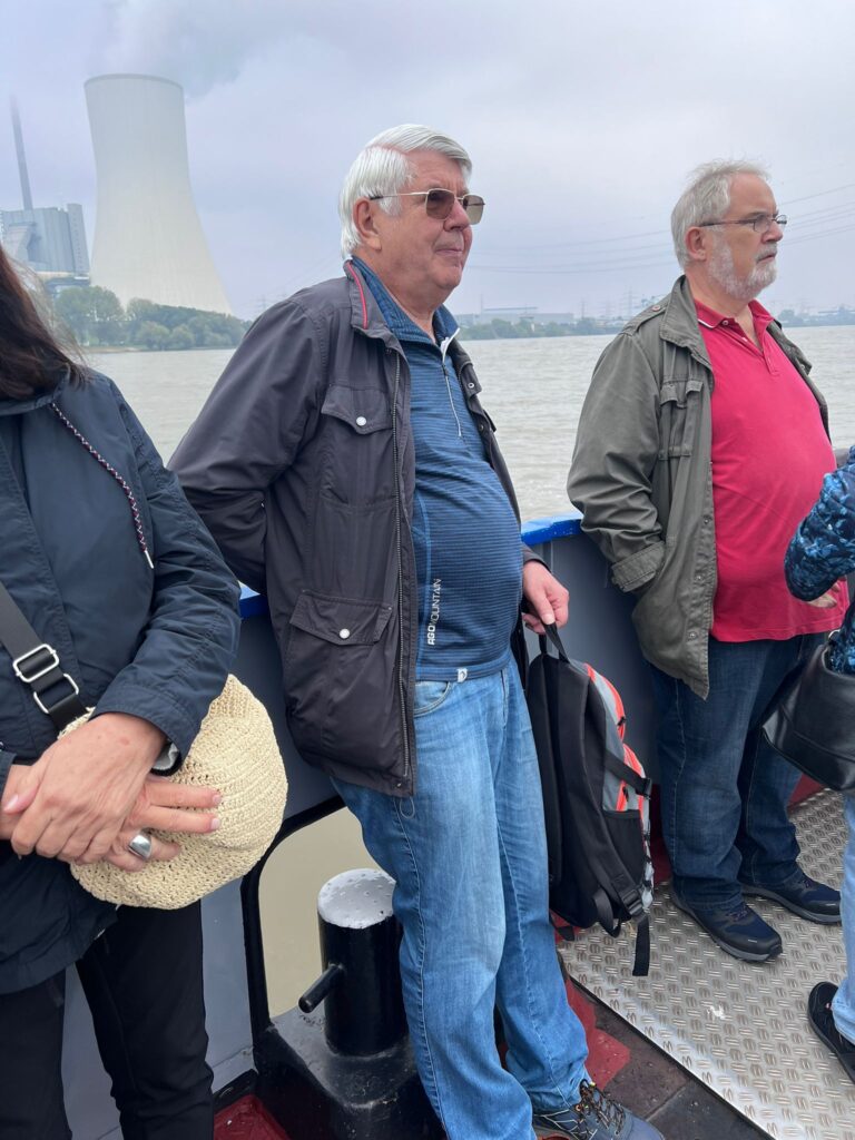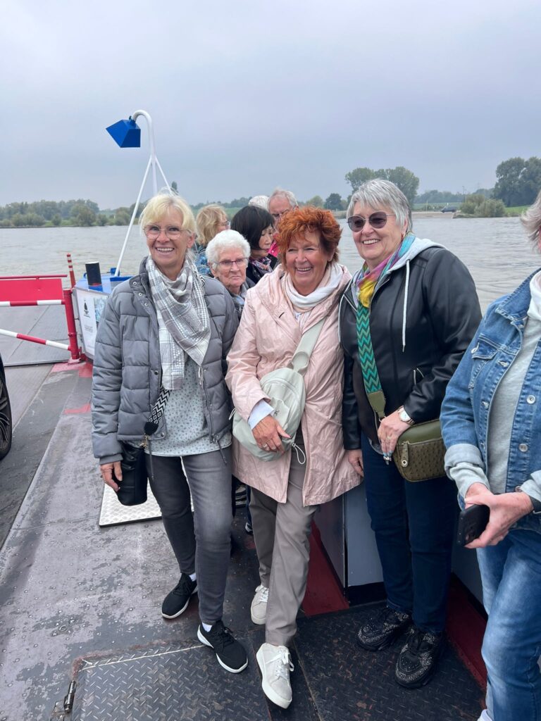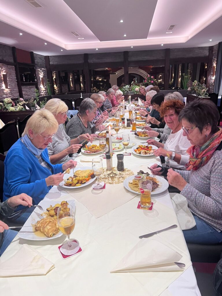 Dort reservierte man uns eine lange Tafel mit weißem Tischtuch und Kerzenleuchter darauf. Die ausgiebig reichhaltige Speisekarte ließ uns das Wasser im Munde zusammenlaufen. Trotz angebotener Seniorenteller waren die Portionen sehr, sehr groß. Nichtsdestotrotz mussten wir schweren Herzens die Heimreise antreten und machten den Verdauungsgang zum Fähranleger. Ein letztes Highlight auf der Fähre war das tolle Lichtspiel. Welches uns die tiefliegende Sonne, die doch noch einmal hervorlugte, bot und sich auf der Wasseroberfläche spiegelte. Zum Schluss ging es wieder rechtsrheinisch zur Bushaltestelle nach Hause.