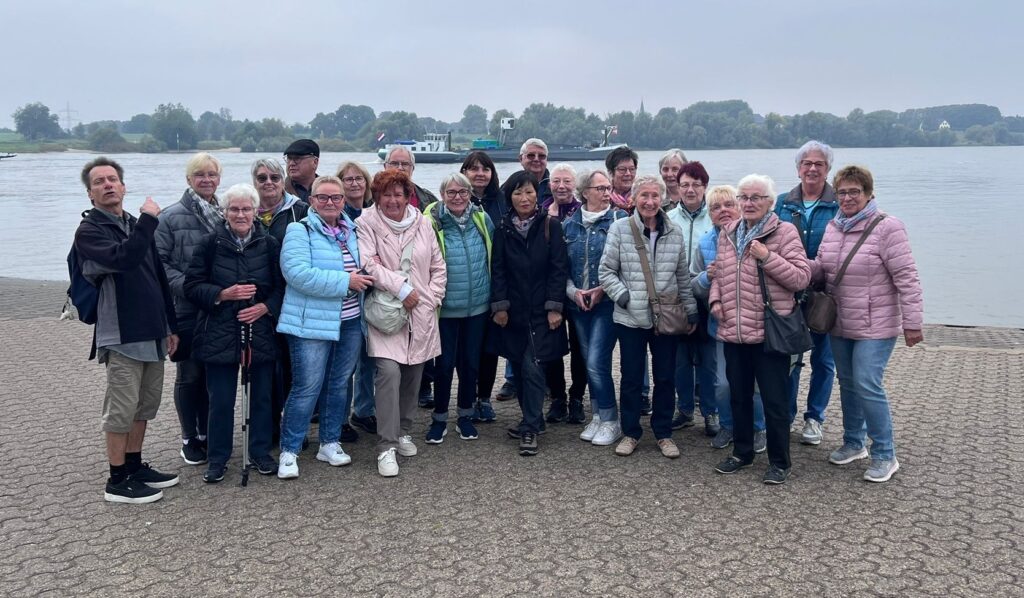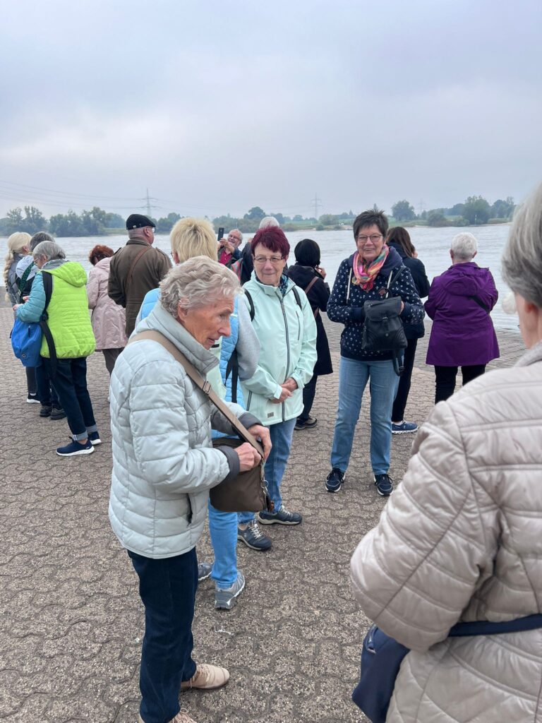 Bei herbstlicher Temperatur und Wetteraussichten trafen sich 24 Teilnehmer zur diesjährigen Herbstwanderung. In Duisburg Walsum angekommen, spazierten wir zum Warmwerden über eine alte Stahlkonstruktions-Brücke. Von dort hatten wir einen bemerkens-werten Blick auf das Steag Heizkraftwerk mit seinem imposanten 180 m. hohem Kühlturm auf der rechten Rheinseite. Danach erblickten wir das erste Mal Vater Rhein und gingen hinunter zum Fähranleger. Die Fähre brachte uns nach einer gelungenen 180 Grad Drehung sicher auf die andere Uferseite. Zum Eingang nach Orsoy machten wir eine erste Pause am Hochwasserschutztor. Entlang der Deich-Promenade schauten wir noch einmal von der linken Rheinseite auf den großen Fluss.