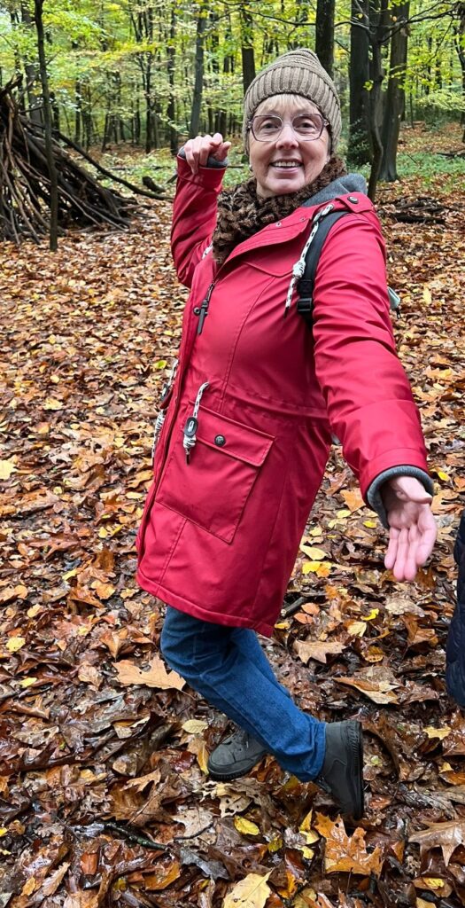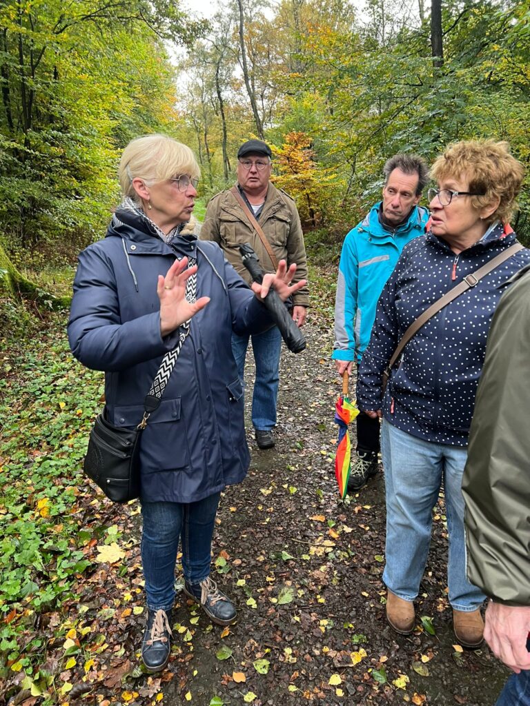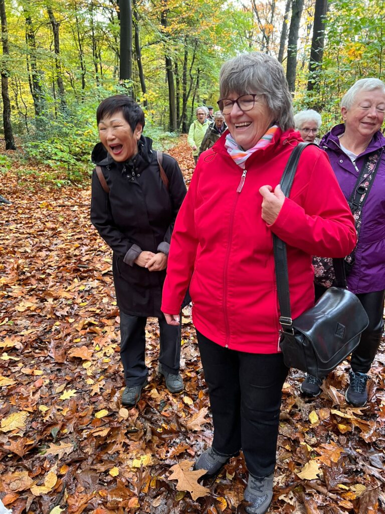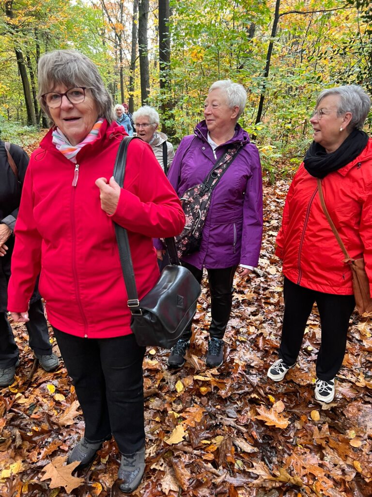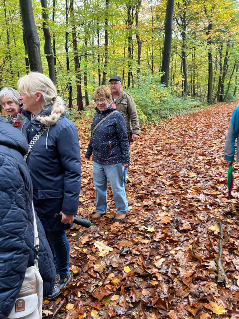 Für unsere Wanderung wählten wir eine etwa 4,5 Kilometer lange Route, die uns einen guten Eindruck von der Schönheit des Waldes vermitteln sollte. Da es in den Tagen zuvor immer wieder geregnet hatte, war der Waldboden stellenweise aufgeweicht, und wir mussten aufmerksam und vorsichtig gehen. Doch die Stimmung in unserer Wandergruppe war trotz des unbeständigen Wetters ausgesprochen gut. Wir genossen die frische Herbstluft, die bunten Blätter in Gelb-, Rot- und Brauntönen und das leise Rascheln unter unseren Schuhen. Der Regen, der während der Tour erneut einsetzte, konnte uns die Freude nicht nehmen – im Gegenteil: Er verlieh dem Wald eine besondere Atmosphäre und ließ die Farben noch intensiver leuchten.